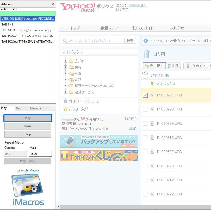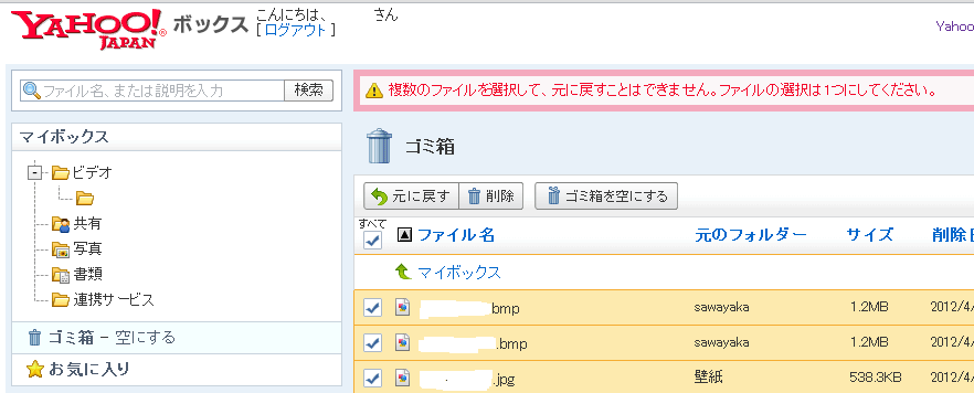 °ì±þ¡¢Yahoo¥Ü¥Ã¥¯¥¹¤Î¥´¥ßÈ¢¤Ë¤ÏÆþ¤Ã¤Æ¤¤¤ë¤Î¤Ç¤½¤ì¤ò¸µ¤ËÌ᤽¤¦¤È¤·¤¿¤é¡¢¡ÖÊ£¿ô¤Î¥Õ¥¡¥¤¥ë¤òÁªÂò¤·¤Æ¡¢¸µ¤ËÌ᤹¤³¤È¤Ï¤Ç¤¤Þ¤»¤ó¡×¤È¤¤¤¦¥á¥Ã¥»¡¼¥¸¤¬¢¢¢