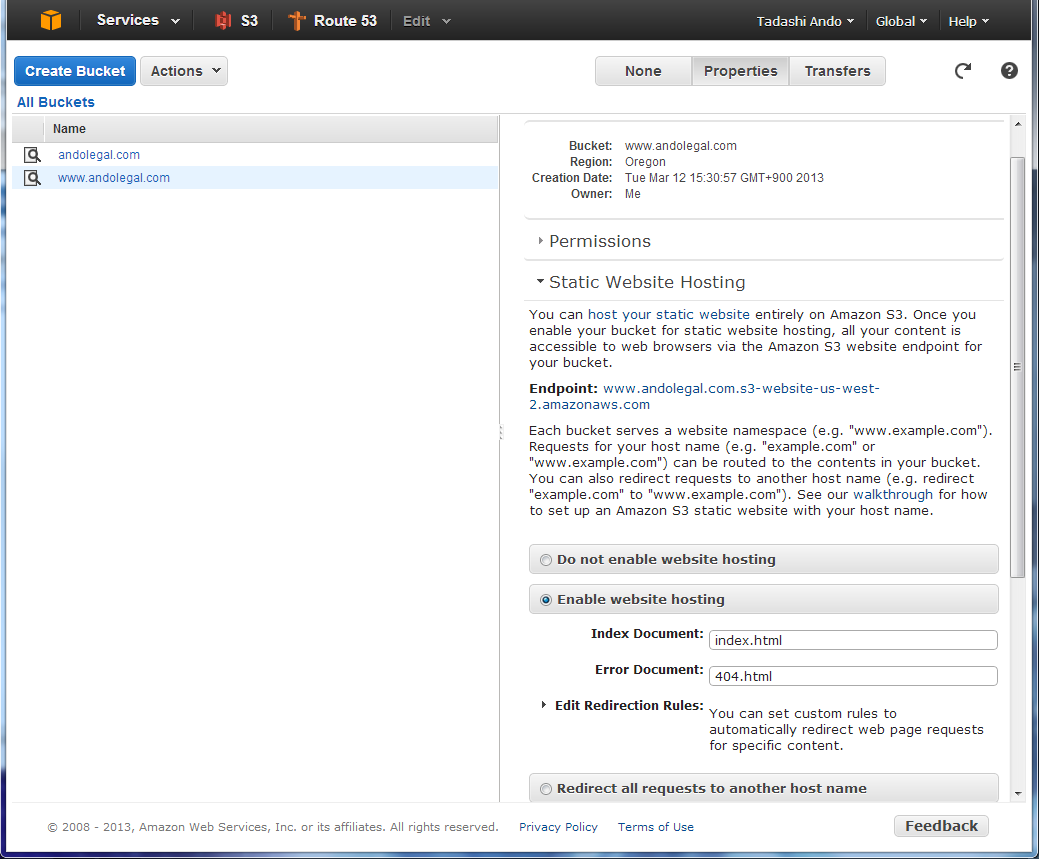 ¾åµ²èÁü¤Î¤È¤ª¤ê¡¢www¤¢¤ê¤ÇÅý°ì¤¹¤ë¾ì¹ç¤Ï¡¢www¤¢¤ê¤Î¥Ð¥±¥Ã¥È¤Î¤Û¤¦¤òEnable website hosting¤Ë¤·¤Æ¡¢index¥É¥¥å¥á¥ó¥È¤È¥¨¥é¡¼»þ¤Ëɽ¼¨¤µ¤ì¤ë¥É¥¥å¥á¥ó¥È¤ò»ØÄê¡£www¤Ê¤·¤Î¥Ð¥±¥Ã¥È¤ÏRedirect all requests to another host name¤ò¥Á¥§¥Ã¥¯¤·¡¢Å¾Á÷Àè¤È¤·¤Æwww.andolegal.com¤ò»ØÄê¡£